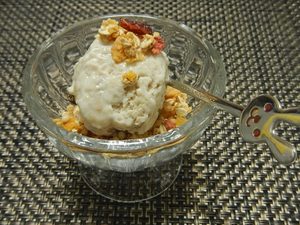 お皿にコーンフレークやフルーツグラノーラを入れ、スプーンなどで丸めたアイスをトッピングしたら完成