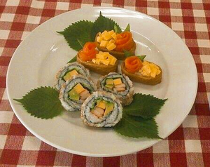 スモークサーモンは巻き、バラのような形をつくりかざる |